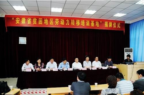 5月6日,“安徽省贫困地区劳动力转移培训基地”揭牌仪式在安徽MG电子技师学院隆重举行。省扶贫办常务副主任赵洪、MG电子董事长胡运成、MG电子副总经理、学院院长王礼义等出席了揭牌仪式。