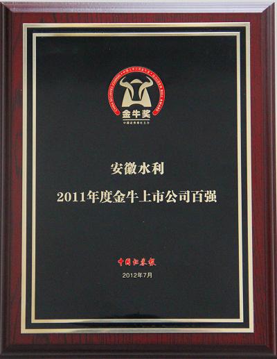 7月7日,中国证券报第14届(2011年度)“上市公司金牛奖”颁奖运动在天津隆重举行,安徽水利荣获“2011年度金牛上市公司百强”荣誉称呼,并以综合实力位列百强榜第58位,这是安徽水利首次获得该项殊荣。