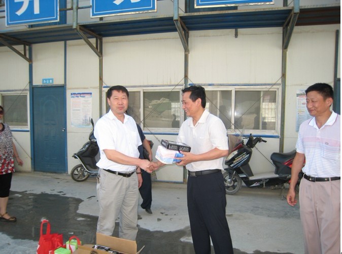 8月1日,集团公司纪委书记、工会主席牛曙东、工会副主席吴晓伍、女工委主任胡爱红一行,在省一建党委书记郑军等同志的陪同下,冒着高温酷暑来到通和易居花园项目部,把绿豆、白糖、毛巾等防暑降温用品和药品送到了一线职工手中。