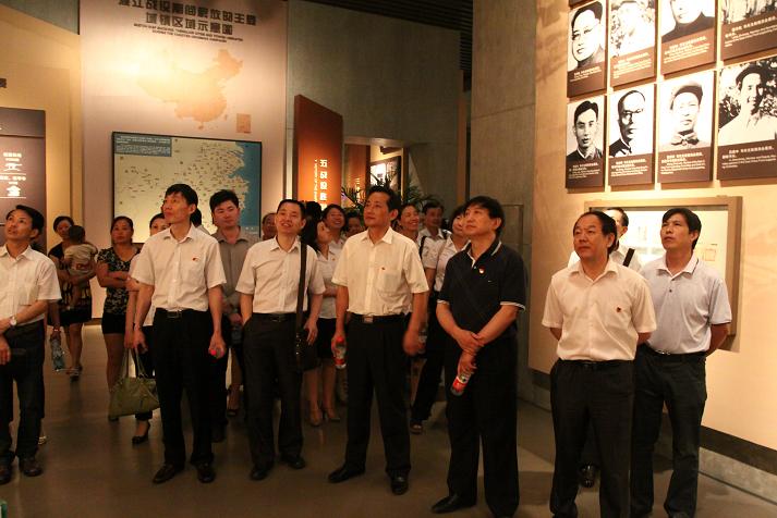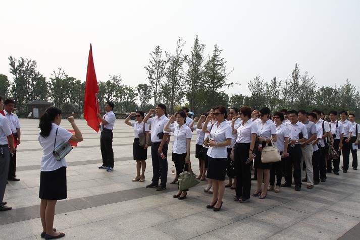 在渡江战役总前委的塑像前,全体党员面对党旗,面对先烈,庄严举起右手,新党员入党宣誓,老党员重温誓词。全体党员庄严允许。随后,各人进入渡江战役纪念馆旅行,配合学习和缅怀先烈们的英雄事迹。