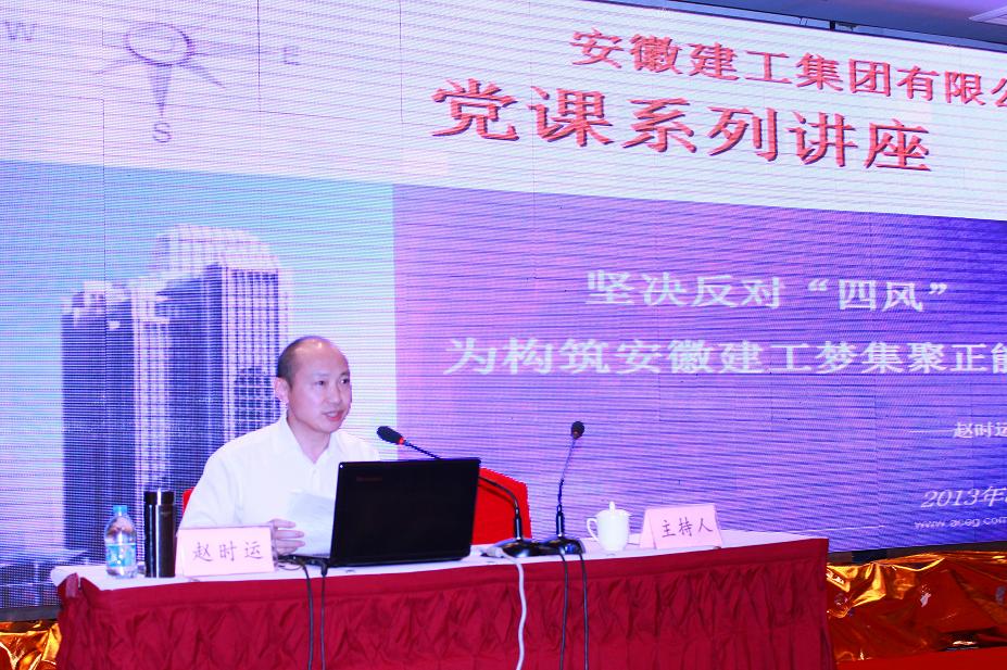 “功崇惟志,业广惟勤。”MG电子有限公司党委书记、董事长赵时运于8月14日下午,来到水建总公司为中层以上治理人员及机关全体党员、入党积极分子近170人上了一堂题为《坚决阻挡四风,为构筑安徽MG电子梦集聚正能量》的专题党课;集团公司党委副书记、副董事长李长斌主持党课。