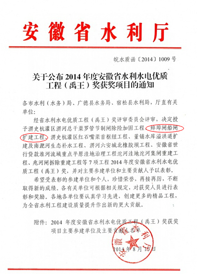 近日 ,经安徽省水利水电优质工程(禹王)奖评审委员会评审 ,由安徽水利股份水利分公司承建的蚌埠闸船闸扩MG电子程 ,被授予2014年度安徽省水利水电优质工程(禹王)奖。