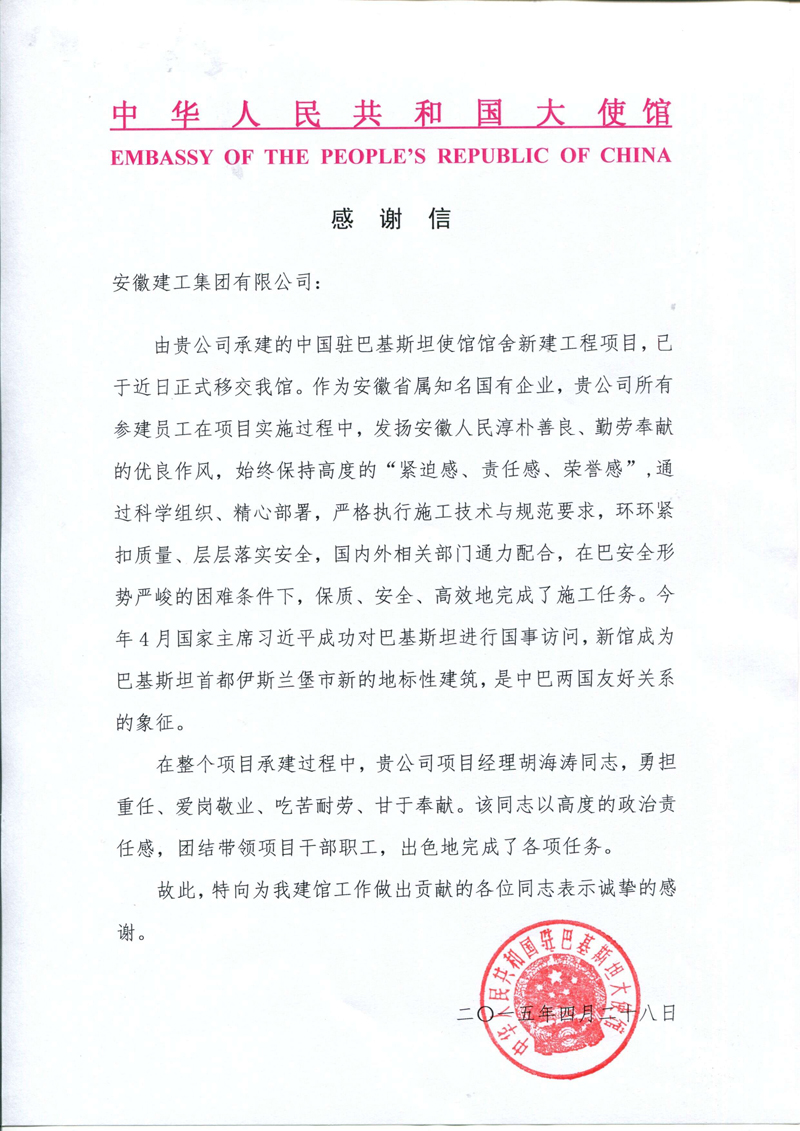 日前,集团公司收到中国驻巴基斯坦大使馆发来的谢谢信,信中对集团公司在承建中国驻巴基斯坦使馆馆舍新MG电子程项目中,保质、宁静、高效地完成施工任务体现谢谢,对项目经理胡海涛同志的精彩体现给予高度赞扬。