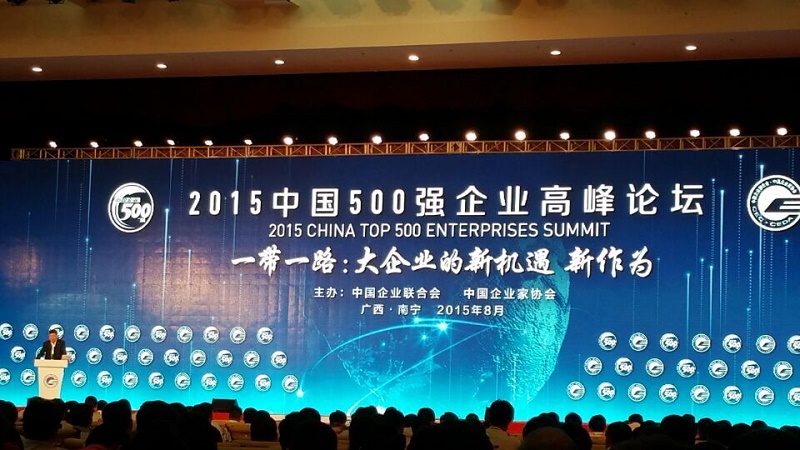 2015年8月21日至23日,中国企业联合会在广西南宁召开“2015中国500强企业岑岭论坛” 。第十届全国政协副主席、中国企业联合会会长王忠禹、广西壮族自治区党委书记、自治区人大常委会主任彭清华、广西壮族自治区主席陈武、国务院国资委副主任刘强、工业和信息化部副部长辛国斌、韩国新万金开发厅厅长李秉国到会并讲话, 集会宣布了2015中国企业500强、中国制造业企业500强、中国效劳业企业500强、中国跨国公司100大榜单 。