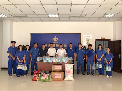 公司领导每到一处,都首先来到温度最高,热浪最强的一线施工现场,虽然烈日当空,可是每到一处都会看到安徽路桥集团施工一线红旗招展,机械轰鸣,一片大干忙碌的景象,领导们每到一处,最先体贴的就是正在作业的一线施工人员,向他们体现亲切的问候,并亲手将绿豆、白糖、毛巾、洗发水、香皂等防暑降温慰问品以及藿香正气口服液风、油精、十滴水等防暑降温药品送到一线职工手中,嘱咐项目治理人员要合理安排员工作息时间,接纳有效防暑降温步伐,包管高温作业条件下员工的身体健康。