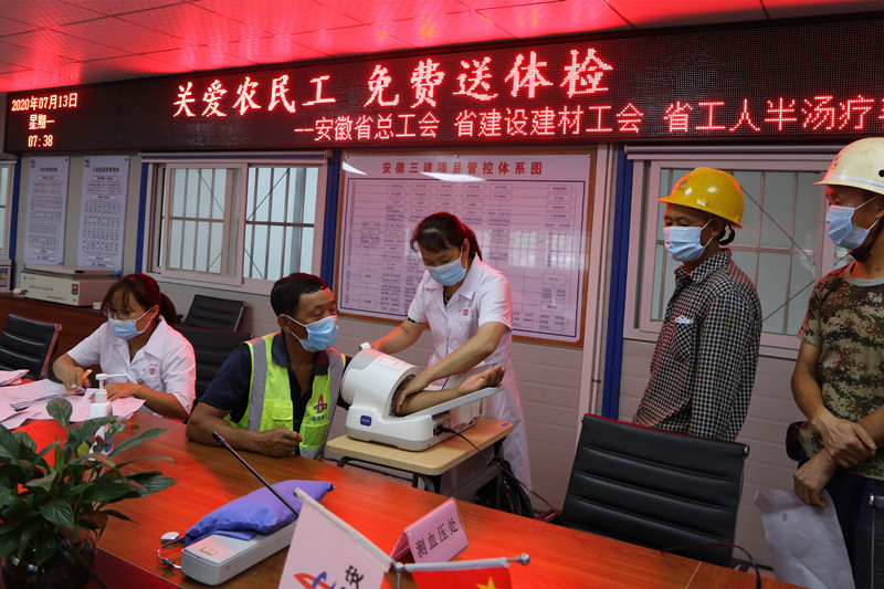7月13日,由安徽省总工会组织,省建设建材工会、省工人半汤温泉疗养院承办的“关爱农民工、免费送体检”运动来到了安徽三建合肥市中心图书馆项目,近120名现场农民工加入了体检。