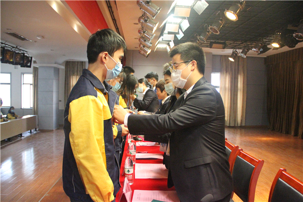 五系一部团总支卖力老师为新团员代表佩戴团徽并宣布了团员证,全体新团员在都会治理系陆梦瑶老师的领导下,面对鲜红的团旗,举起右拳以最嘹亮的声音进行庄严宣誓。在高喊出自己名字的那一刻,新团员们肩负起了作为一名共青团员庆幸而神圣的使命继续。新团员代表建筑艺术系任佳佳同学谈话,她在谈话中体现作为共青团的新成员,会时刻以一名优秀团员的标准要求自己,努力学习技术,成人成才,用实际行动实践自己的入团誓言。