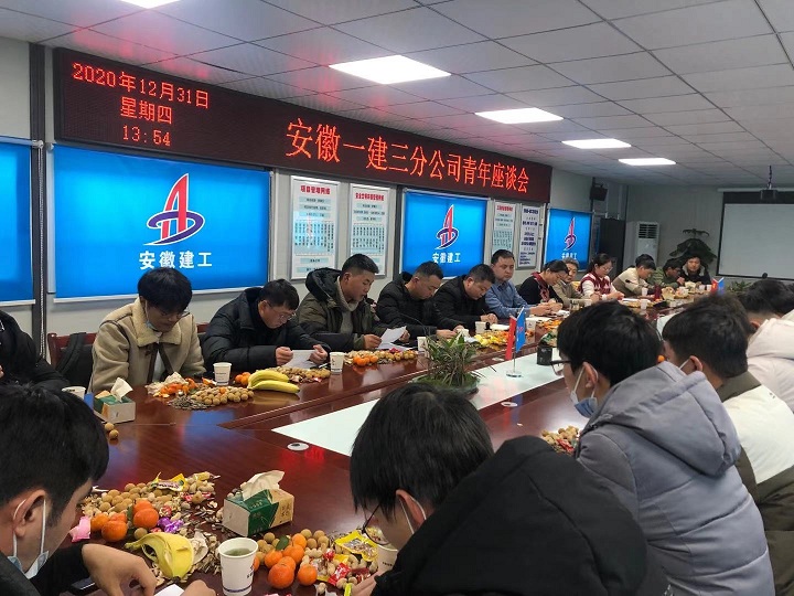2020年12月31日,安徽一建三分公司在锦绣龙川府EF地块项目部集会室召开青年座谈会。分公司领导、机关及所属项目部青年职工代表近60人加入座谈。