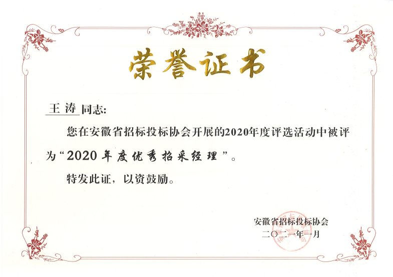 党员、集团招标中心王涛同志荣获安徽省招标投标协会评为