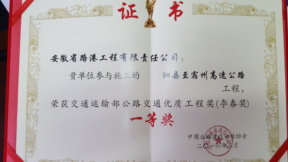 °²»Õ·¸Û¹«Ë¾ÔÙ´ÎÕ¶»ñÈ«¹ú¹«Â·½»Í¨ÓÅÖʹ¤³Ì½±£¨Àî´º½±£©Ò»µÈ½±