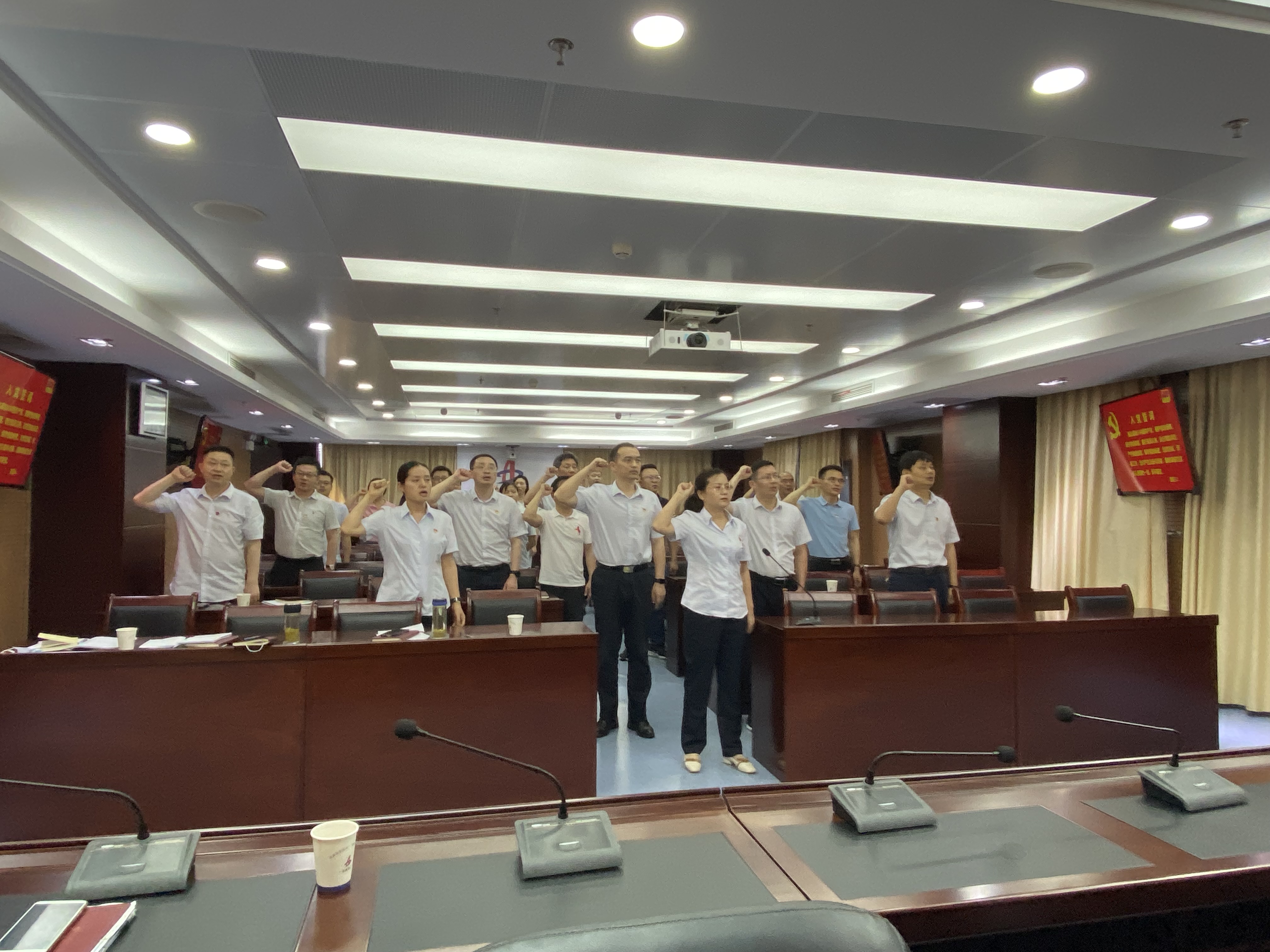 最后,党支部全体党员面对党旗庄严宣誓,重温入党誓词。坚定有力的誓言,表达不忘初心、砥砺前行的信念和决心,让每一位党员的心灵再次受到震撼和洗礼。