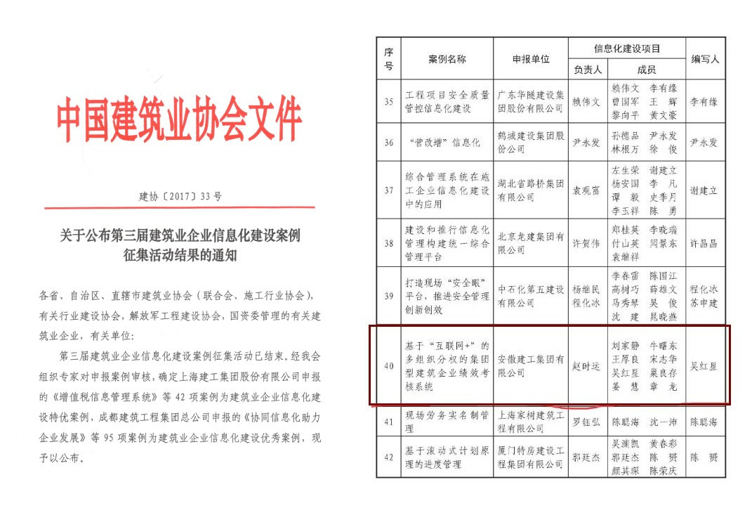 由中国建筑业协会组织开展的第三届建筑业企业信息化建设案例评选运动揭晓,MG电子申报的《基于“互联网+”的多组织分权的集团型建筑企业绩效考核系统》,获评为第三届全国建筑业企业信息化建设特优案例。截止目前集团已经有两项信息化系统获得了全国信息化建设特优案列。