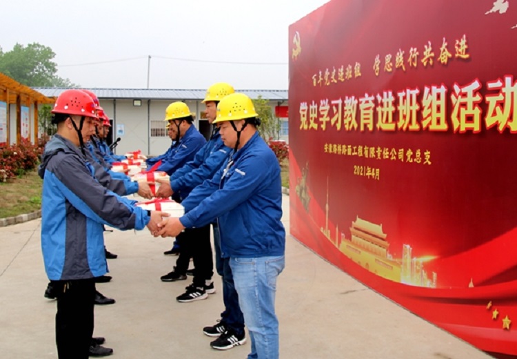 为立异党史学习教育形式,推动党史学习教育向下层延伸,4月23日上午,安徽路桥路面公司党总支围绕“百年党史进班组 学思践悟共奋进”主题,开展党史学习教育进班组运动,重温党的辉煌历史,接受红色文化洗礼。所属项目支部书记、班组党员代表加入。