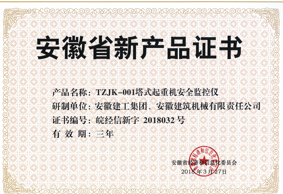 日前,MG电子及所属安徽建机公司研发的“TZJK-001塔式起重机宁静监控仪”顺利通过安徽省经信委省级新产品鉴定,确认为2018年安徽省新产品(第一批)。