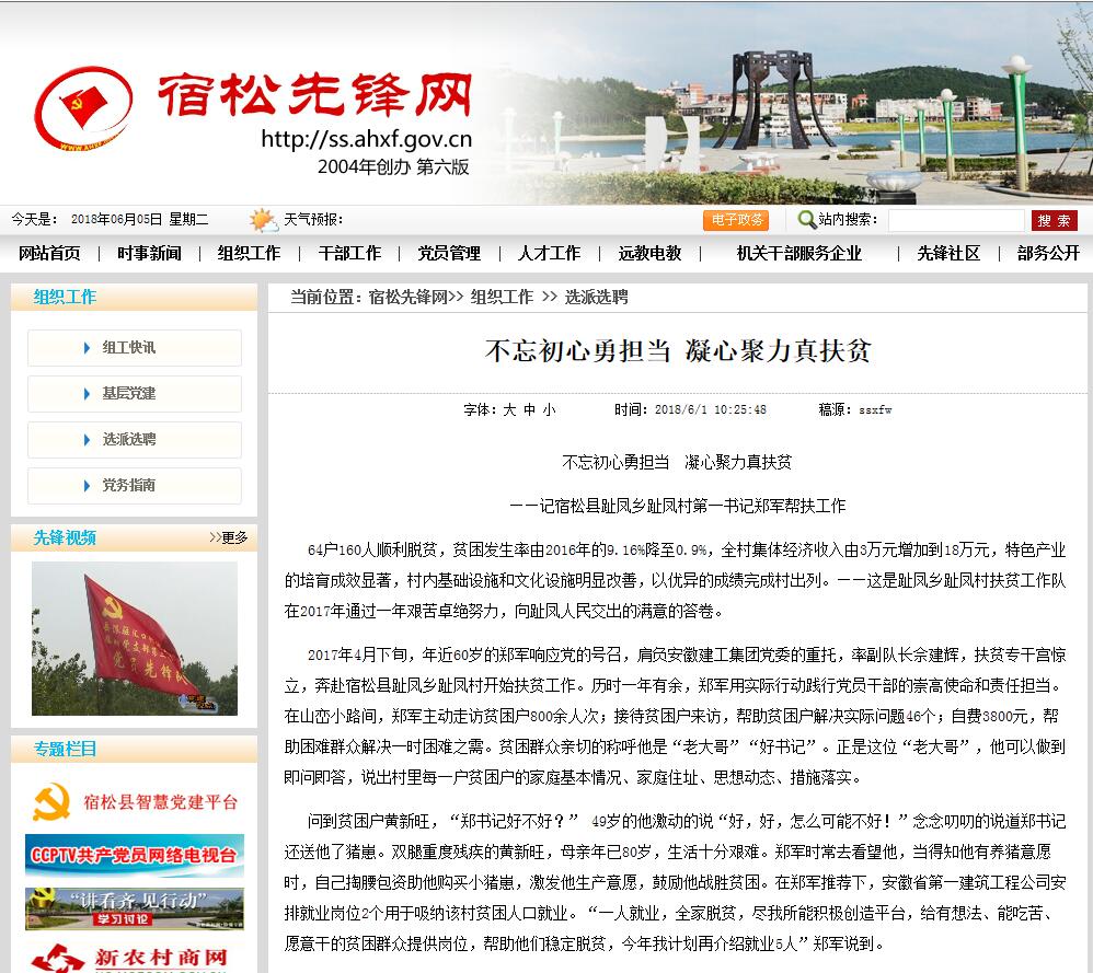 6月1日,《宿松先锋网》以《不忘初心勇继续 凝心聚力真扶贫》为题,对MG电子自2017年4月以来,积极响应党和国家招呼,情系贫困群众、立异扶贫方法的典范做法和显著效果等进行了专题报道。