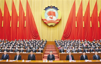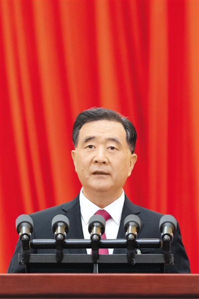 汪洋代表政协第十三届全国委员会常务委员会,向大会报告事情。