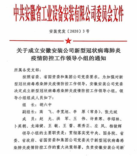 一是组织到位。1月26日,安徽装置公司下发《关于建立新型冠状病毒熏染肺炎疫情防控事情领导小组的通知》,卖力贯彻落实上级关于新型冠状病毒熏染肺炎疫情防控事情的重大决策安排,卖力安徽装置公司新型冠状病毒熏染肺炎疫情防控事情的领导,研究解决安徽装置公司疫情防控中的重大问题,统筹组织防控处理。