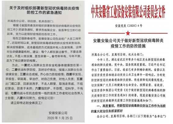 二是安排到位。疫情防控事情开展后,1月25日(大年月朔)安徽装置公司发出防控疫情事情的紧急通知,1月27日制定肺炎疫情防控步伐,对疫情防控事情进行细化安排,周密安排。要求各分公司、直属项目部、各部分要以对职工群众生命宁静高度卖力的态度,精准施策,坚决停止疫情在安徽装置公司输入、蔓延,勉励职工戴口罩、勤洗手、多通风、少走动、常消毒。