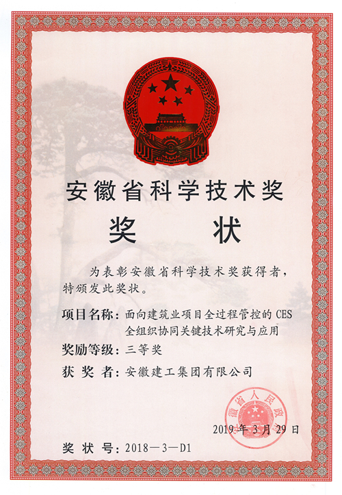 4月11日,安徽省科学技术奖励大会在合肥隆重召开,省委书记李锦斌,中科院院长白春礼,省长李国英等出席大会,集团公司主持申报的《面向建筑业项目全历程管控的CES全组织协同要害技术研究与应用》荣获安徽省科技进步奖三等奖,这是集团公司信息化建设历程中首次获得的安徽省科学技术奖。