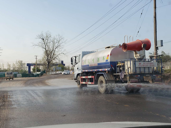 气温逐渐升高,项目部每天都安排洒水车多频次清洒场区内外路面,进行喷洒、降温降尘事情,严格按要求坚持工地现场卫生整洁。