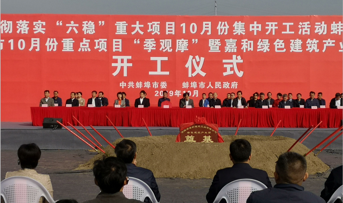 10月28日,安徽水利嘉和建筑工业工业园项目现场,彩旗飘扬,挖掘机、推土机整装待发;缀着横幅的空飘犹如一串串大红灯笼高高挂在空中,随处洋溢着喜悦的气氛。蚌埠市10月份重大项目集中开工暨嘉和绿色建筑工业园项目开工仪式在此隆重举行。