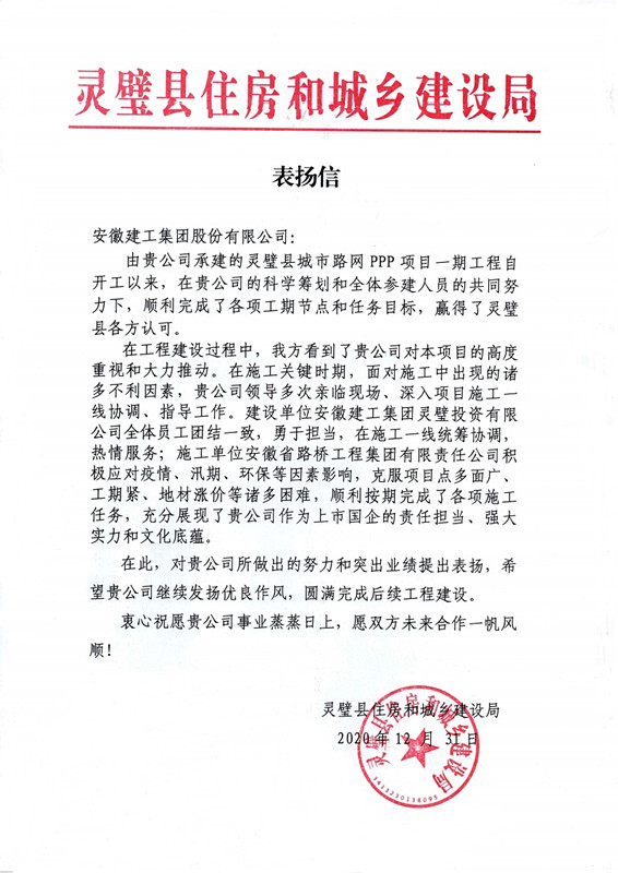 12月31日,灵璧县住房和城乡建设局向MG电子股份有限公司发来表扬信,高度赞扬了公司投资建设的灵璧县都会路网PPP项目一期工程2020年取得的优异结果,充分肯定安徽MG电子的建设实力、责任继续和良好企业形象。