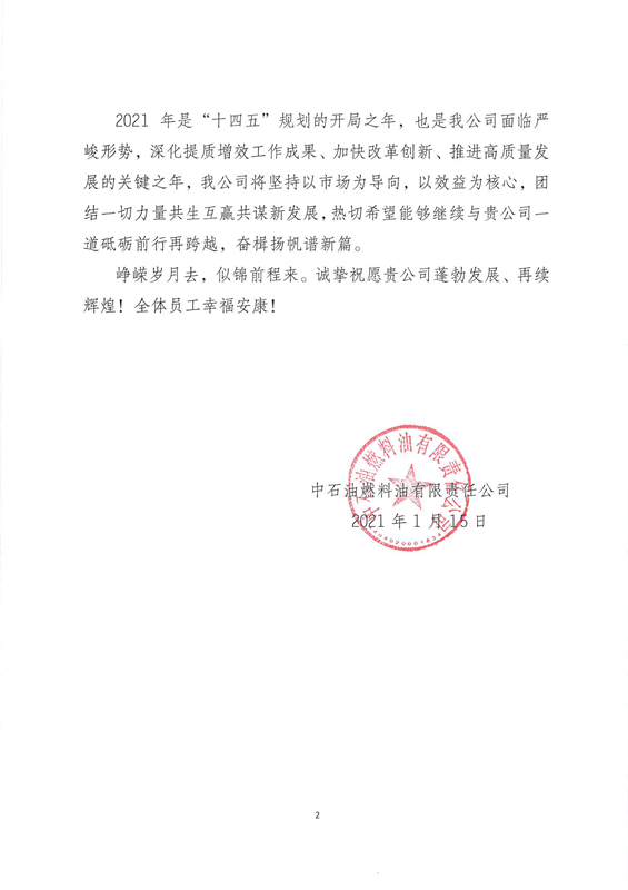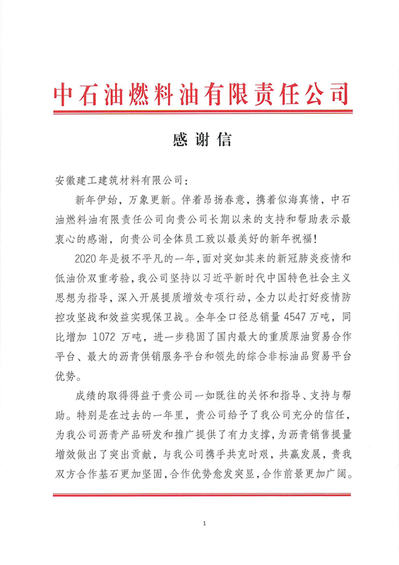 此次中石油燃料油公司给安建建材送来谢谢信,标记着双方相助迈向了一个新的台阶。随着双方的相助升级,相信在未来能够继续深入探讨共赢新模式,开辟相助新征程。