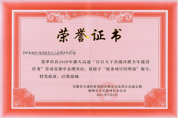 滁天高速02标、滁天高速预制标项目部荣获安徽交控集团百日大干劳动竞赛“优秀项目经理部”称呼。