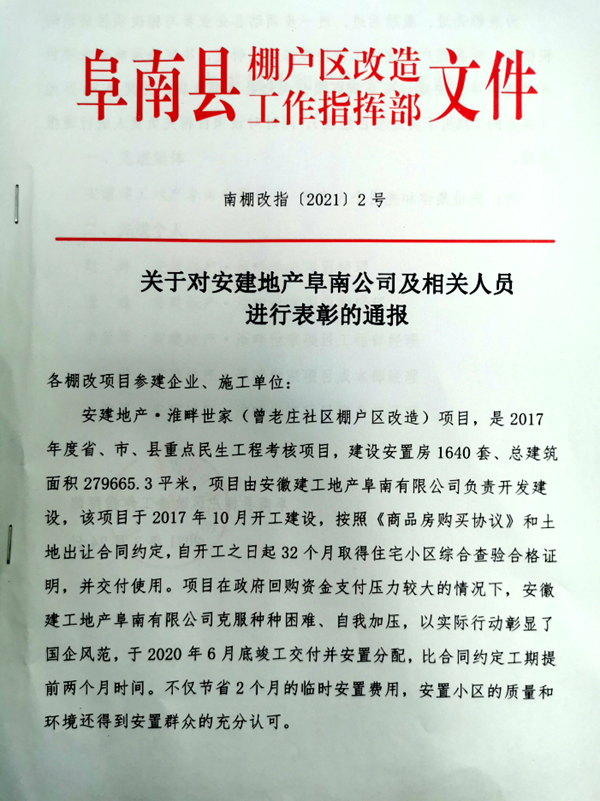 4月6日,由安建地产开发建设的淮畔世家项目获得阜南县棚户区革新事情指挥部全县通报表扬,并获得奖励30万元。