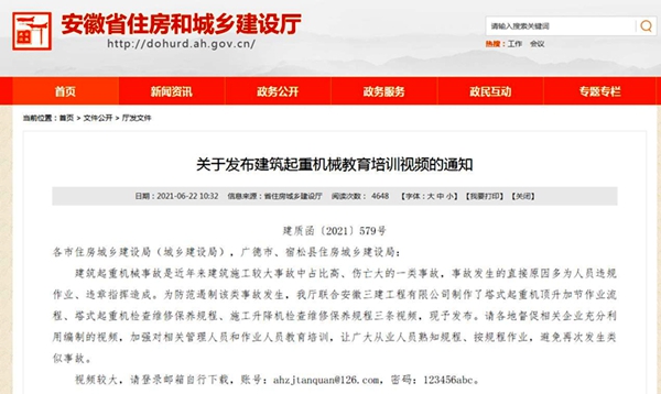 6月24日,安徽省住房和城乡建设厅给安徽三建公司发来表扬信,谢谢该公司联合省住建厅制作建筑起重机械教育培训视频,对增进我省建筑起重机械从业人员教育培训起到了积极作用。