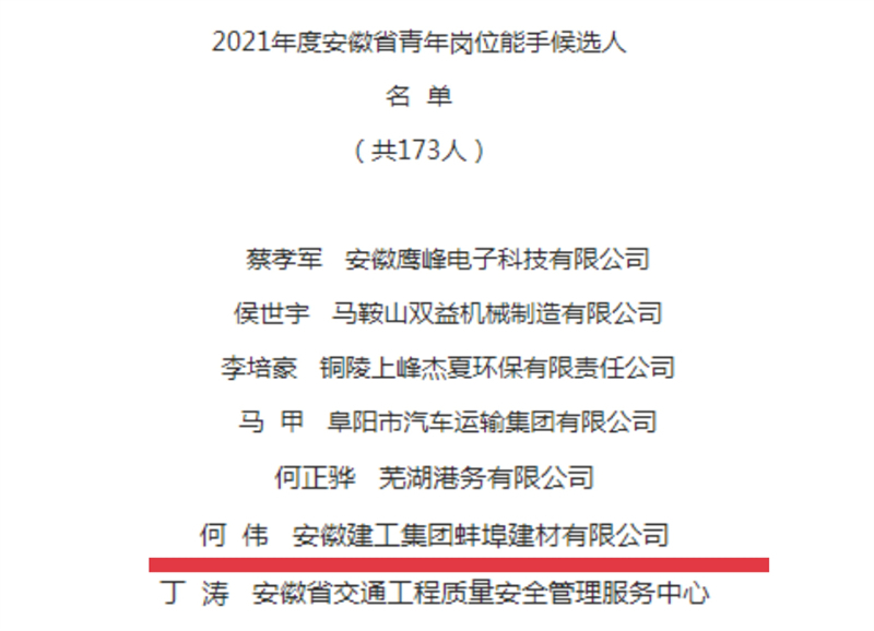 近日,共青团安徽省委传来喜讯,安徽MG电子建材科技集团有限公司职工何伟被授予“2021年度安徽省青年岗位能手”荣誉称呼。