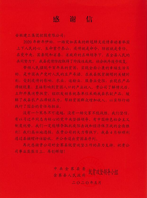 近日,集团收到中共金寨县委、金寨县人民政府脱贫攻坚领导小组的谢谢信,对集团在疫情期间大力开展消费扶贫,资助金寨县解决农副产品滞销问题的义举给予了高度评价和衷心谢谢。