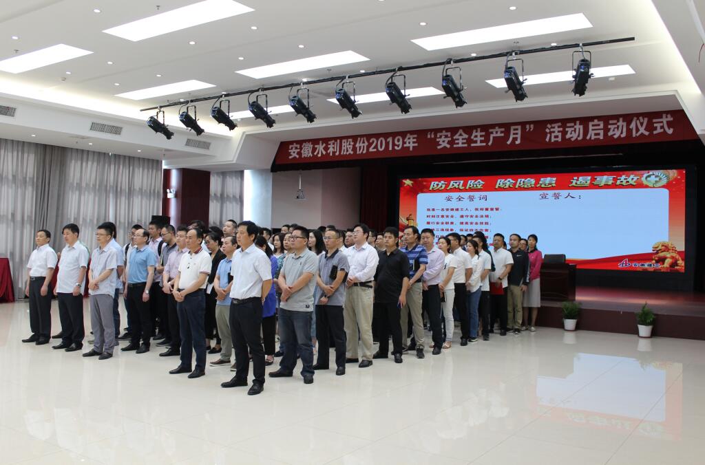 5月31日上午,安徽水利开发股份有限公司举行了以“防危害、除隐患、遏事故”为主题的2019年“宁静生产月”运动启动仪式。股份公司安委会主任、总经理许克顺出席仪式并讲话,股份公司安委会副主任、副总经理孙学军主持仪式并领誓,股份公司总工程师杨斌、股份机关全体员工、安建建设、安建外洋及安建财务相关人员加入了启动仪式。