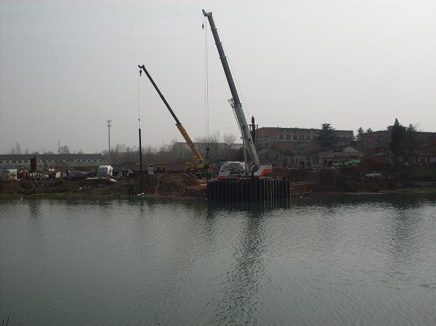 淠望路大桥作为市政工程具有工期紧、任务重、技术难度大的特点,但经项目部领导精心组织、科学安排,加大人力与设备的投入,自2月1日进场开工以来,全部90根挖孔桩已开挖41根,累计深度270m;于2月18日开始进行要害工序——主墩右幅钢板桩围堰施工。由于淠史杭干渠担负皖豫两省14个县(区)的春耕浇灌任务,六安市重点办要求加速施工进度,必须在4月15日完成所有水下工程及用于水面以上施工的支撑等,并于4月25日前完成围堰拆除清理事情。项目部立即召开紧急发动会,招呼全体技术人员克服一切困难和挑战,坚决完成上级交代的任务,并立即组织技术人员凭据钢板桩长度、水深、地质、承台埋置深度等情况,制定了科学的施工技术计划、建立了以项目部经理、副经理为组长的宁静领导小组。施工所用的T90振动锤、70t吊车、25t吊车、PC200挖机、 T100推土机、ZLM50装载机、自卸车等重型机械设备陆续开进施工现场。