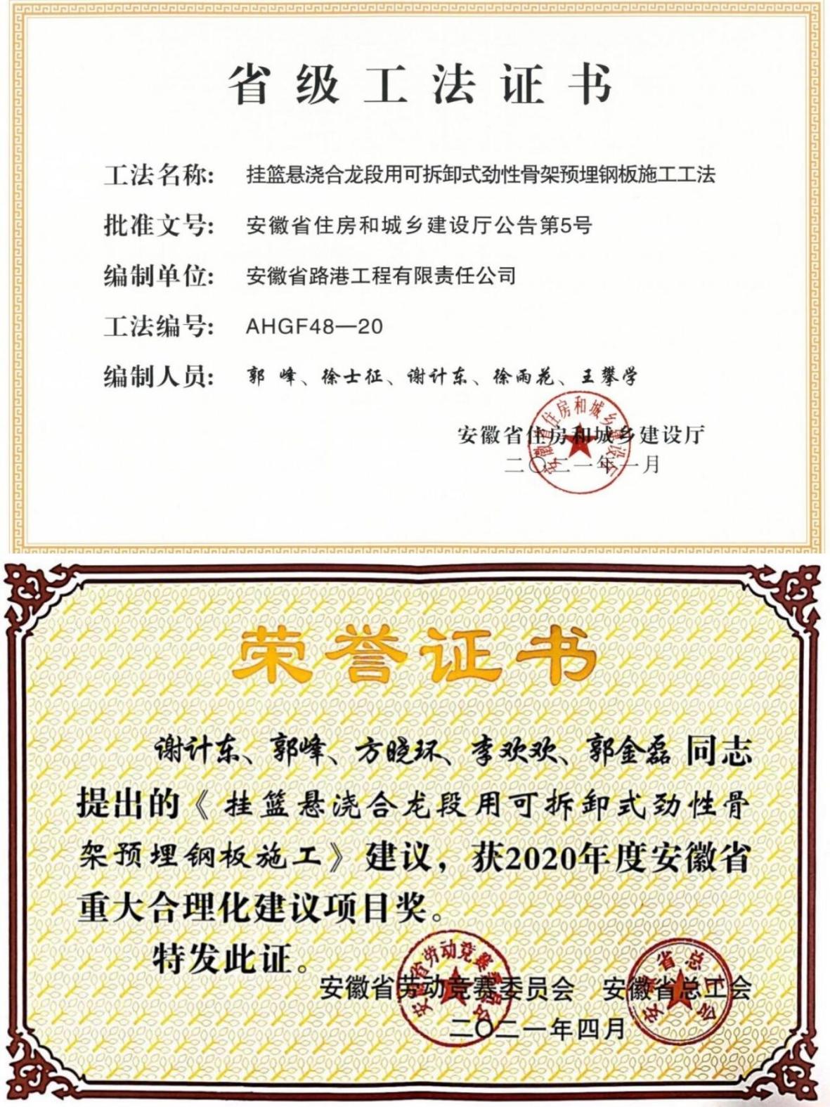 工法和合理化建议证书