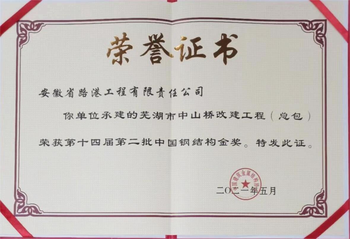 中国钢结构金奖证书