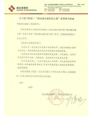 日前,北京盛达森国际工程承包有限公司致函MG电子,盛赞外洋公司副总经理琚效三在利比亚市政项目做出的突出孝敬。北京盛达森国际工程承包有限公司“感动盛达森特别人物”评选委员会授予琚效三副总经理“感动盛达森特别人物”荣誉称呼和一万元人民币荣誉奖金。推选词为:“他来自于一直与我们并肩斗争的金牌同伴,他是安徽MG电子外洋公司副总,他同时执行我司利比亚市政项目经理的角色。他在我司利比亚市政项目遇困时临危受命、不负重托,运用富厚的外洋项目经验,力挽狂澜,为扭转项目时局孝敬力量。他不是盛达森人,但却与盛达森心手相牵;他与盛达森没有特殊情结,却为盛达森带来改变,作为不是盛达森人的盛达森贡献者,他值得敬佩。”