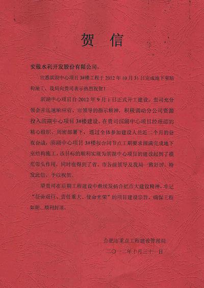 近日,合肥市重点工程局向安徽水利发来贺信,祝贺安徽水利合肥分公司承建的滨湖中心项目3#楼工程圆满完成地下室结构施工。