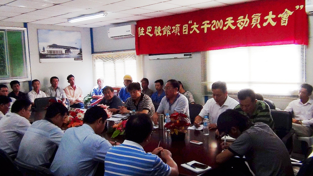 经过一周时间的调研和准备,21日上午,项目部组织召开“驻巴使馆项目大干200天发动大会”。许总参会并代表集团公司董事长赵时运亲切慰问项目全体职工,他要求项目从现在起全面进入抢工阶段,要确保按条约工期履约;强调参会人员要把集会精神转抵达一线,全体职工要坚决执行发动大会的要求;同时将会从集团的层面给予项目支持。从项目治理干部、一线职工到海内后勤包管组,各人都纷纷亮相,一定团结一致掀起大干、快干的新热潮。